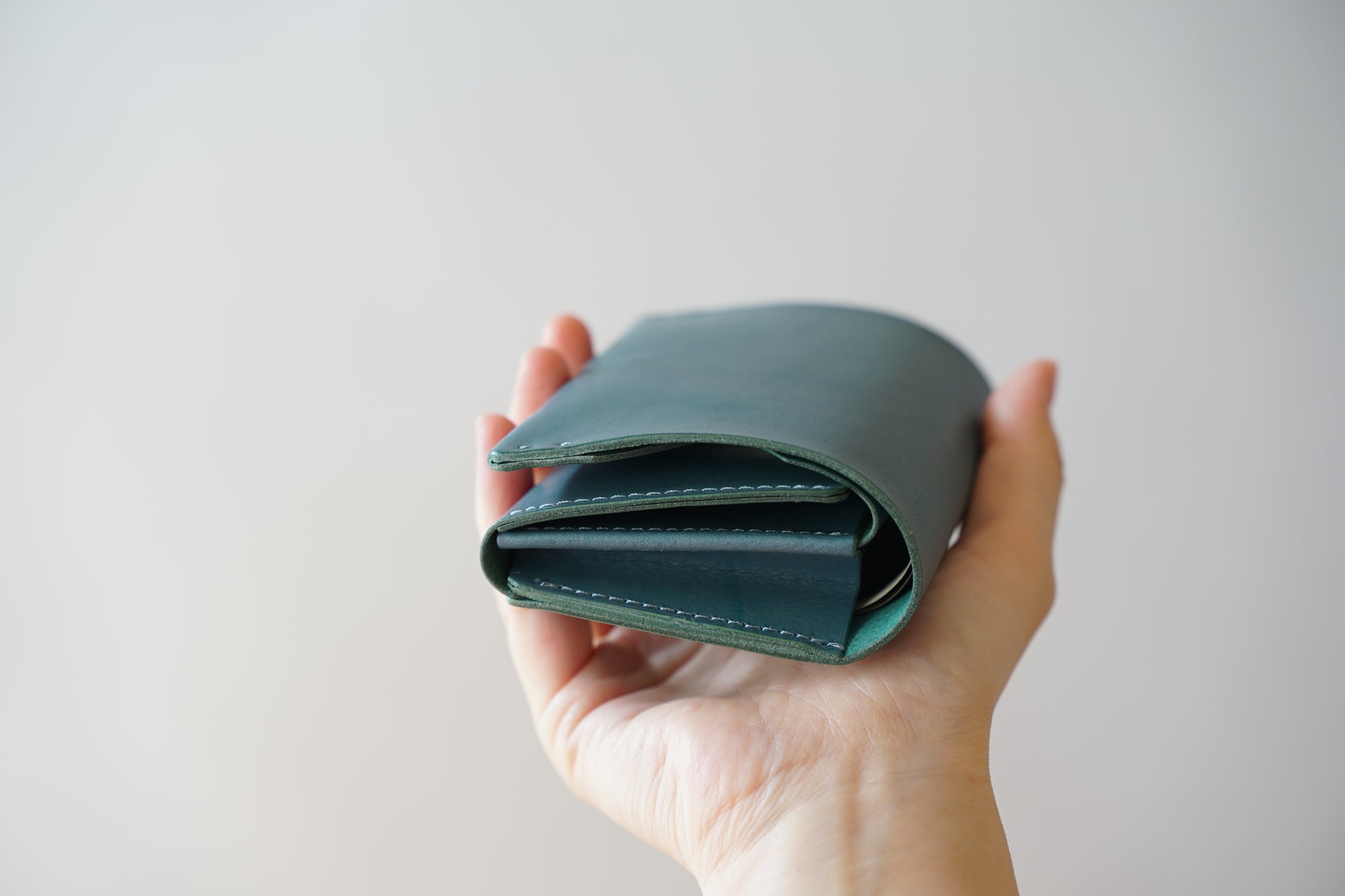 お札も小銭もカードもたっぷり収納できる容量の多い二つ折り財布。