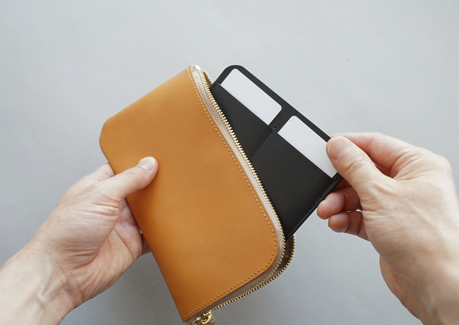 財布とカードケースが別々って、なんだか逆に手間取っちゃう気がしますが、このインナーカードケースはロングジップウォレットとサイズがぴったりなだけでなく、財布を開けてお金を取り出す作業の中に組み込まれているかのように自然な流れで押さえることができるので、まったくストレスなくカードを出し入れすることができます。