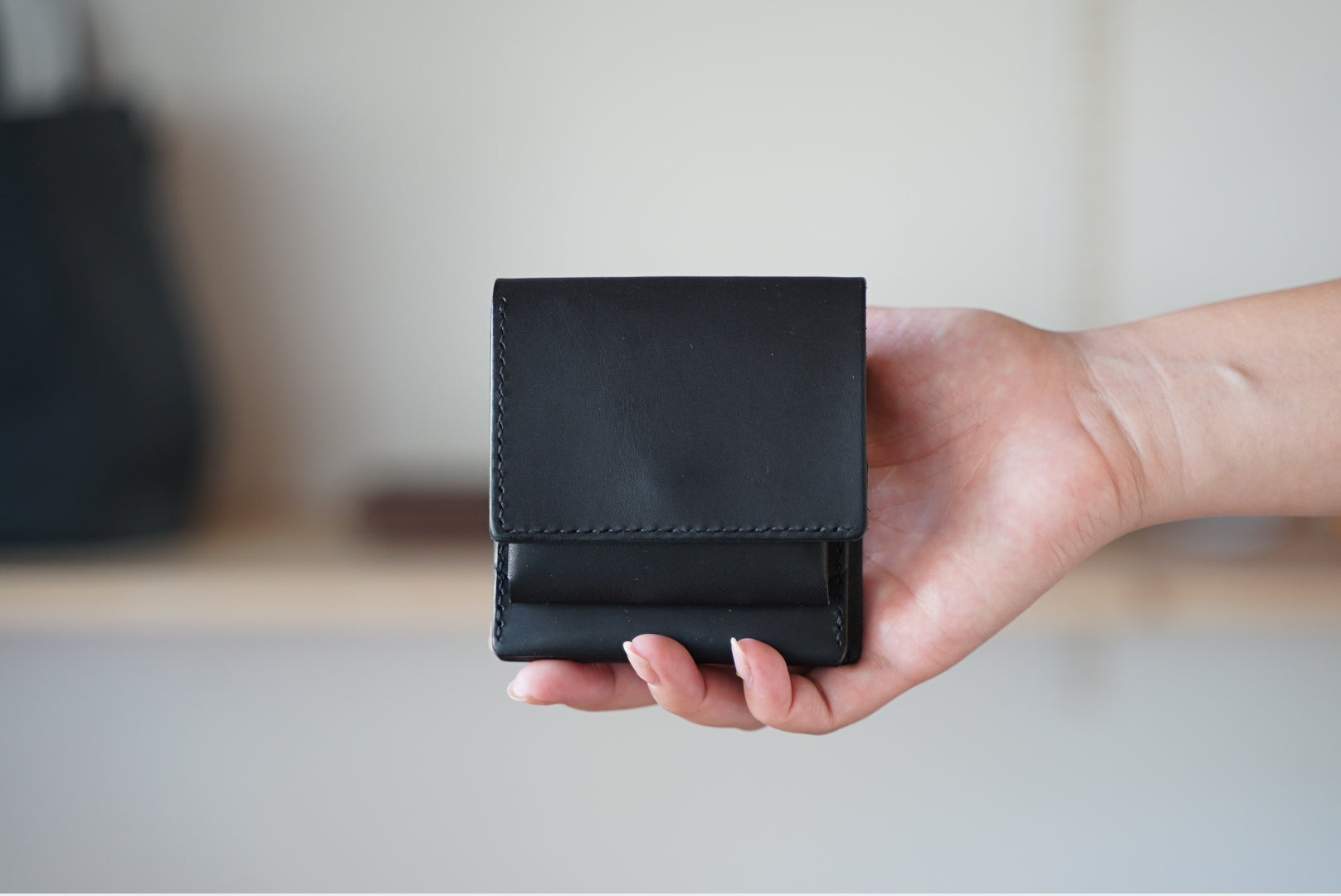 手のひらにおさまるかわいらしいサイズのlayer(うす型二つ折り財布)。