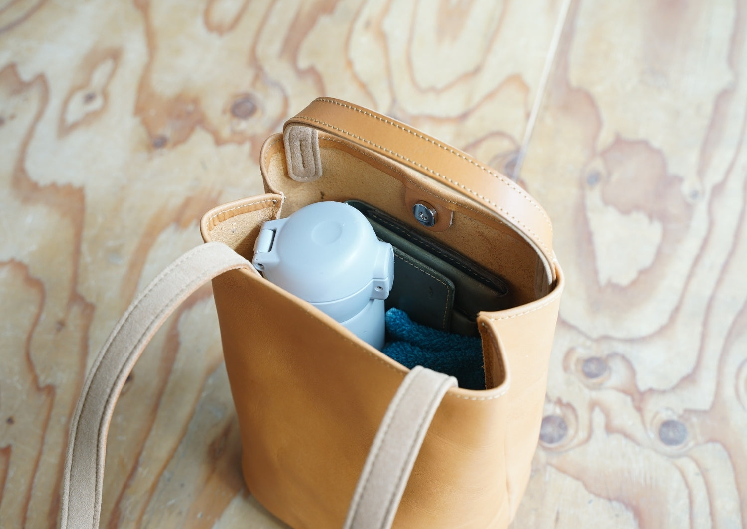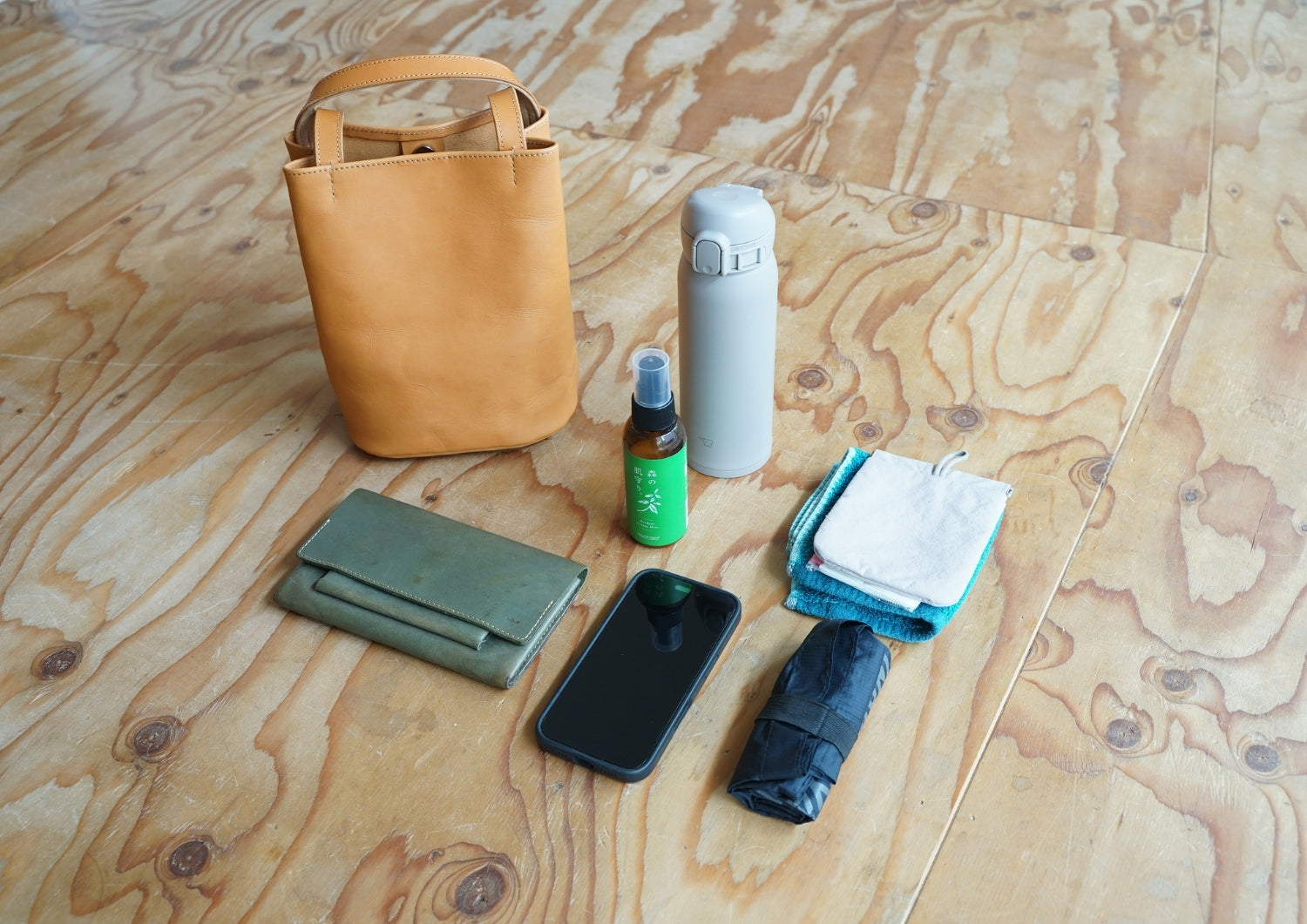 シンプルな筒形フォルムで、収納力としては長財布や500mlペットボトルやタンブラーにタオルハンカチ、キーケースまでは余裕で入るかな。といったところ。スマホは裏側の薄いポケットへぜひ。シンプルだからこそ、持ち手にキーホルダーをつけて個性を出す、なんてこともいい。affordanceのひも付ICカードケースを結んでも便利かつ、ひもが見えて可愛いかも。