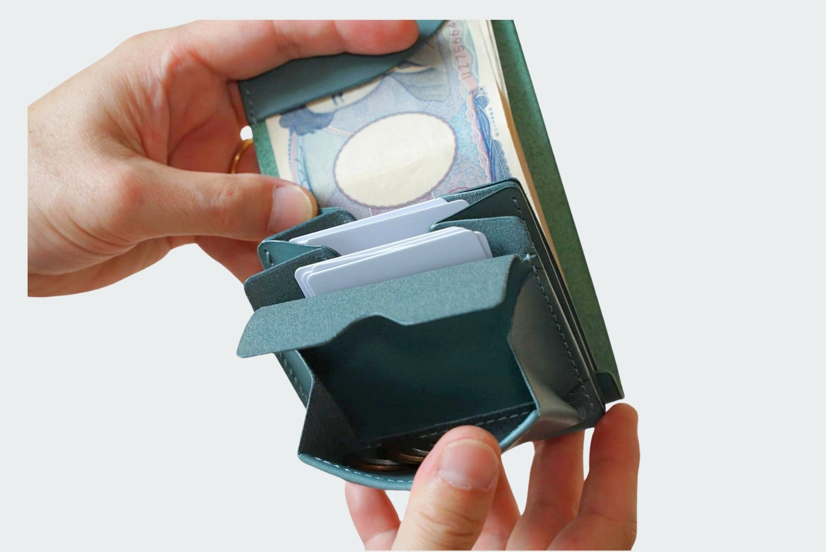 この財布の各部屋は蛇腹形状でコンパクトながら大きく開くのが最大の特徴。